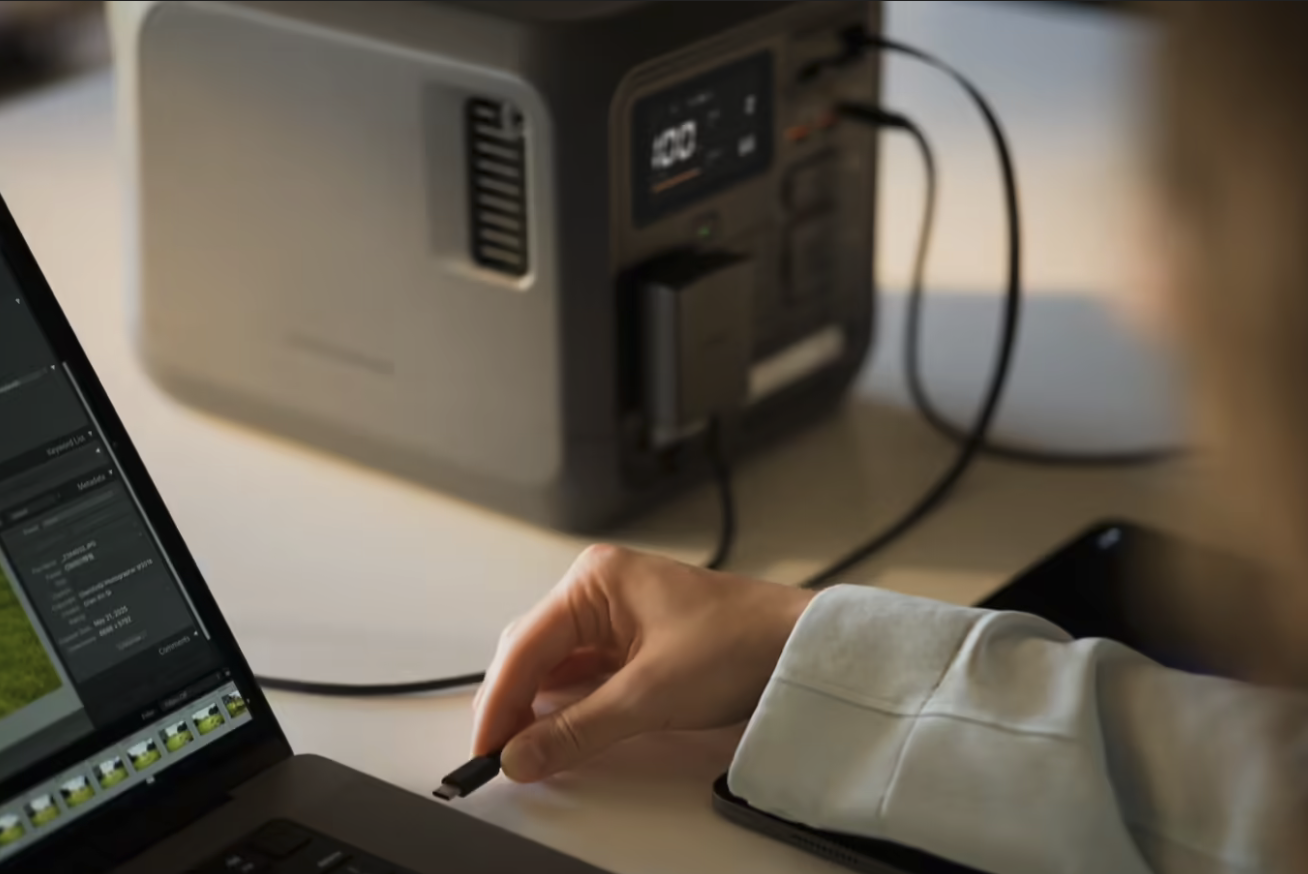 针对户外场景的特殊需求,产品内置400W行车闪充模块与MPPT太阳能充电模块,无需外接配件即可实现高效补能。市电快充模式下,0-80%电量仅需58分钟,充满仅需75分钟;太阳能充电模式下,配合大疆100W折叠太阳能板,日均发电量可达400Wh。此外,产品配备的100W USB-C伸缩线支持自动回弹收纳,线长0.8米,可满足多设备同时充电需求。